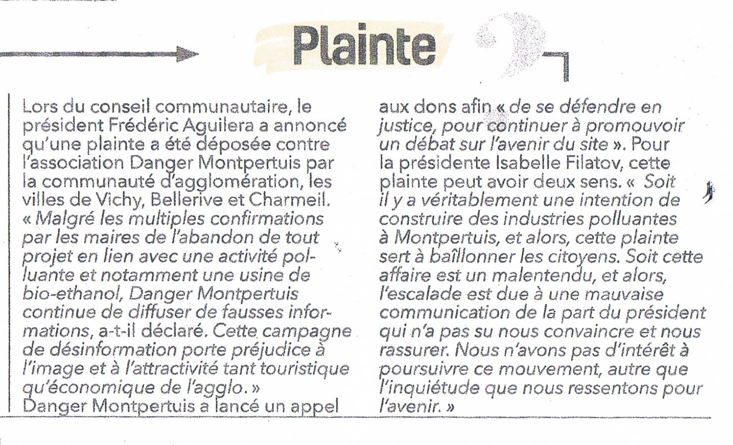 3 - Les procédures-baillons: Le summum de l'omerta a été, bien sûr, l'imposition à notre encontre de trois procédures-baillons en 2018. Suite à des plaintes de Vichy Communauté, nous avons été convoqués dans le cadre de trois enquêtes judiciaires pour diffamation, diffusion de fausses nouvelles et affichage sauvage (article de presse ici). Ces auditions et convocations "en rafale" faisaient suite à des plaintes infondées, qui ont été classées sans suite. Tout cela laisse à penser qu'il s'agissait d'une opération d'intimidation. Nous continuons à soutenir qu'un débat sur l'avenir du site de Montpertuis serait non seulement légal, mais nécessaire. Censurer le débat, c'est faire prospérer le soupçon.
